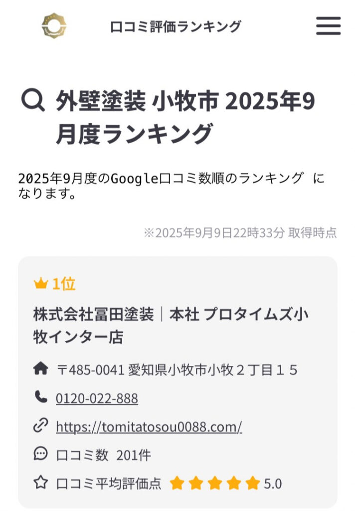 外壁塗装 小牧市2025年9月度ランキングで口コミ評価ランキング1位になりました!!