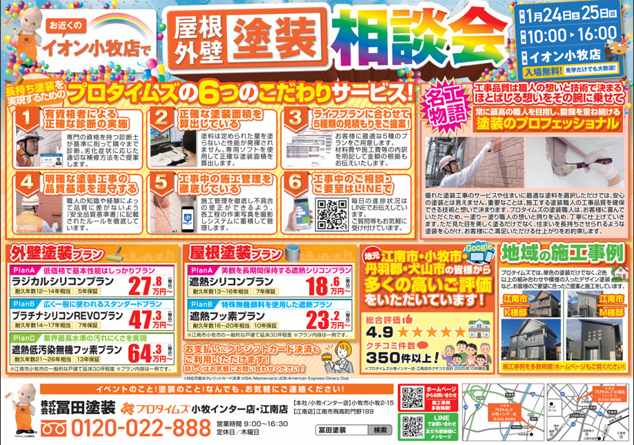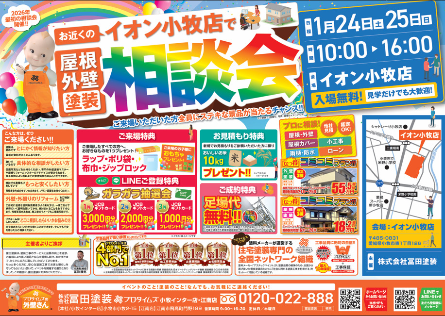プロタイムズ江南店 プロタイムズ小牧インター店 愛知県 外壁塗装小牧市 外壁塗装江南市 外壁塗装扶桑町 大口町 春日井市 愛知県 愛知県屋根修理 一宮市 尾張旭市 北名古屋市 住宅塗装 外壁塗装 外壁修理 屋根塗装 屋根修理 雨漏り修理 コーキング工事 シーリング工事 コーキング シーリング 高圧洗浄 防水加工 網戸張り替え 職人直営店 冨田塗装 地域密着 お客様に感謝 富田 リフォーム 給湯器 江南市外壁塗装 江南市屋根塗装 小牧市外壁塗装 小牧市屋根塗装 春日井市外壁塗装 一宮市外壁塗装 屋根塗装小牧市 補助金 助成金 火災保険 冨田塗装 外壁塗装冨田塗装