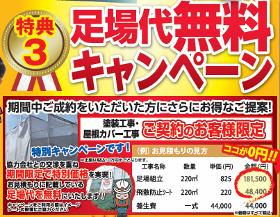足場代無料キャンペーンをはじめ、塗料グレードアップ特典やベランダ防水工事が無料など、引き続き特典を多数ご用意しております!