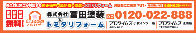プロタイムズ江南店 プロタイムズ小牧インター店 愛知県 外壁塗装小牧市 外壁塗装江南市 外壁塗装扶桑町 大口町 春日井市 愛知県 愛知県屋根修理 一宮市 尾張旭市 北名古屋市 住宅塗装 外壁塗装 外壁修理 屋根塗装 屋根修理 雨漏り修理 コーキング工事 シーリング工事 コーキング シーリング 高圧洗浄 防水加工 網戸張り替え 職人直営店 冨田塗装 地域密着 お客様に感謝 富田 外壁洗浄 給湯器 江南市外壁塗装 江南市屋根塗装 小牧市外壁塗装 富田塗装 江南市外壁塗装補助金 助成金 相場 費用