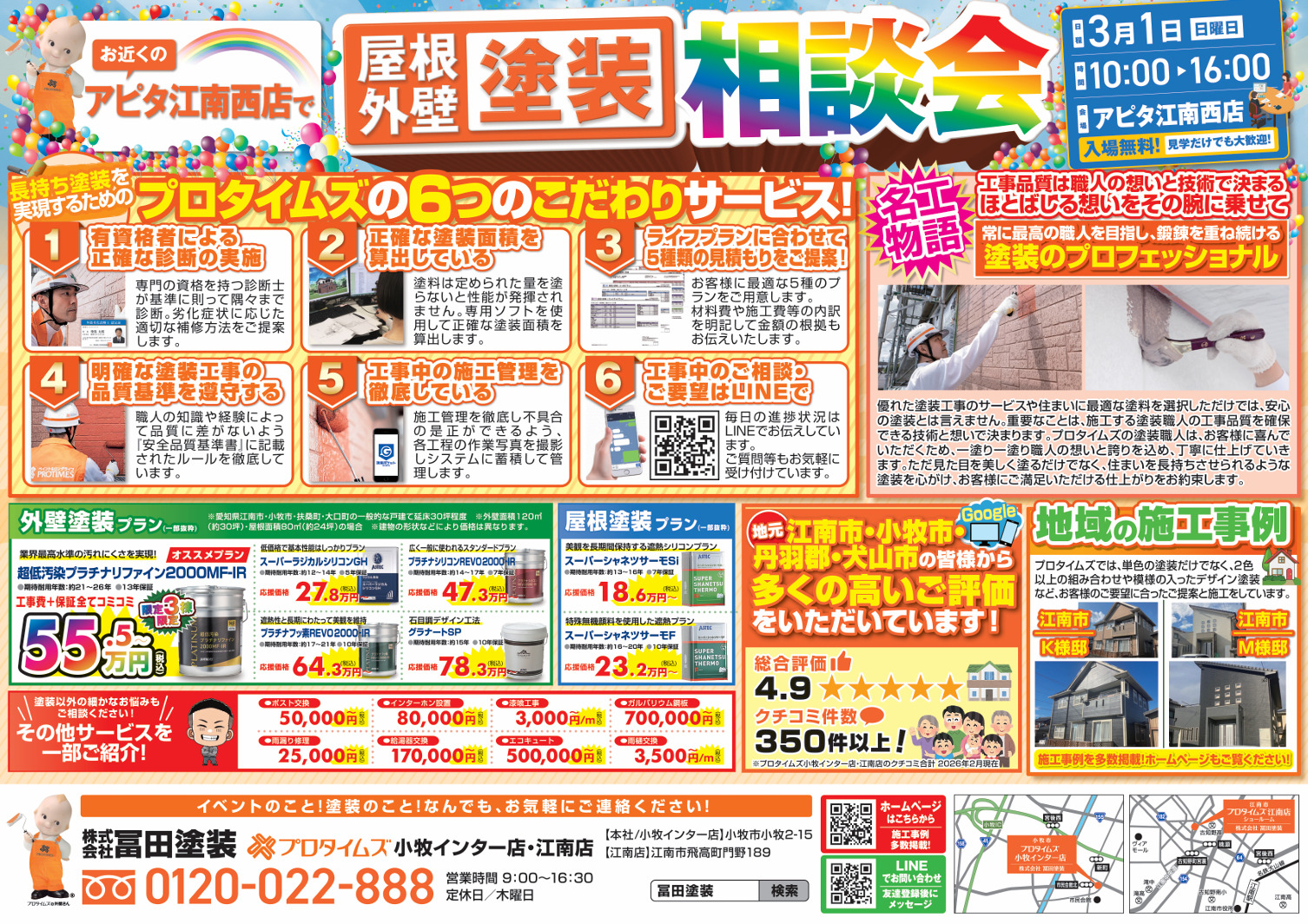 HOME イベント 外壁塗装屋根塗装塗り替え相談会 アピタ江南西店 外壁塗装屋根塗装塗り替え相談会 アピタ江南西店 開催日2026/03/01(日) 時 間10:00~16:00 カテゴリスーパーイベント 場 所アピタ江南西店 イベント内容ご来場されるだけで特典あり❤ LINEを追加してガラガラ抽選会参加できます! 劣化診断士がいますので些細なことでもなんでもお答えいたします! お買い物ついでにぜひお立ち寄りください◎ イベント申し込み Japan お申し込みフォーム お名前 必須 例:塗装 太郎 住所 必須 例:000-0000 例:例:○○県○○市○○0丁目00-00 例:〇〇マンション000 ※空欄可 電話番号 例:09000000000 メールアドレス 必須 例:xxx@xxx.com お問い合わせ内容 ※ご自由にお書き下さい このサイトはreCAPTCHAによって保護されており、Google プライバシーポリシーと利用規約が適用されます。 ピックアップPICKUP 塗装品質へのこだわり 有資格者による建物診断 わかりやすく納得の見積り ショールーム