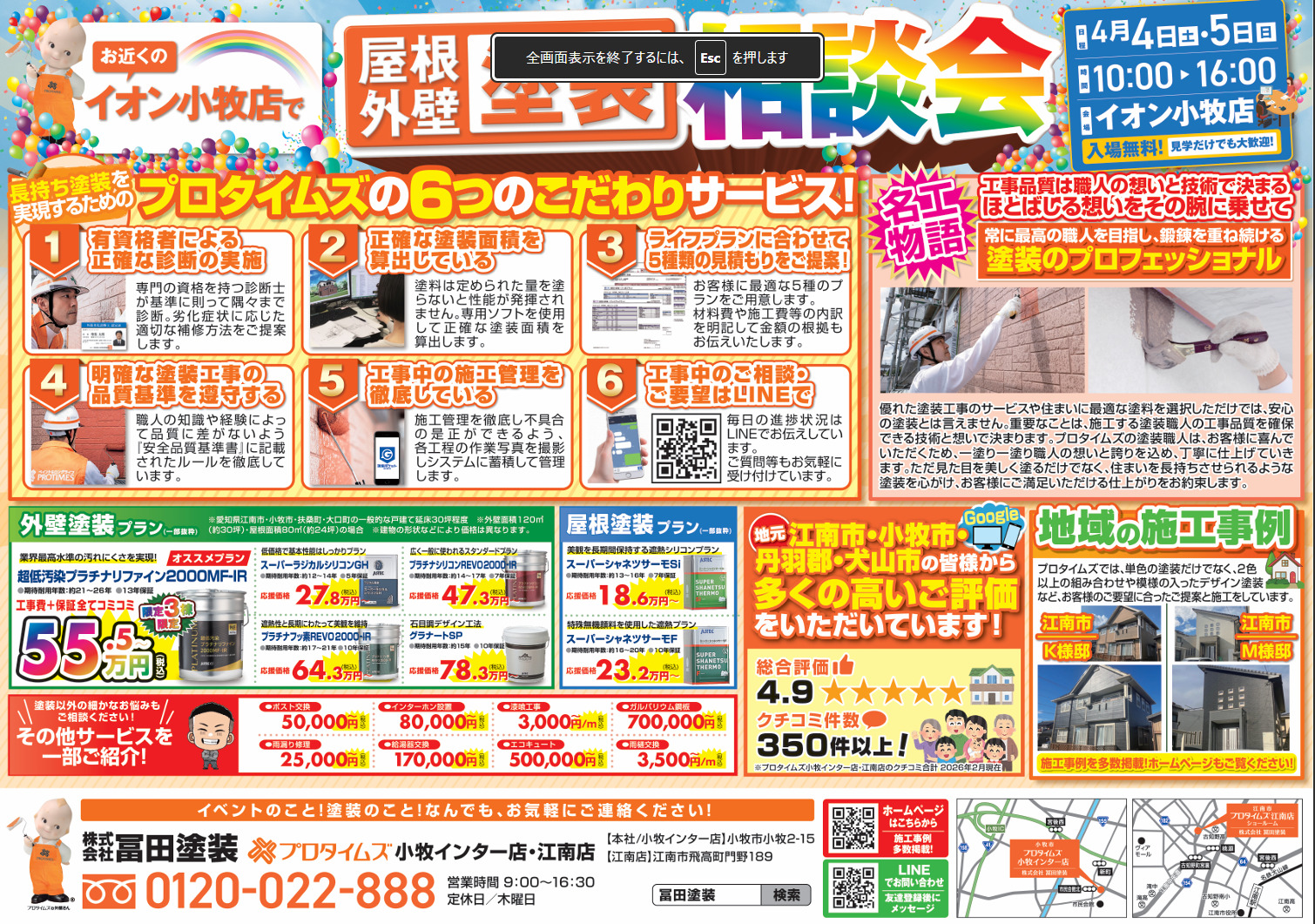 HOME イベント 外壁塗装屋根塗装塗り替え相談会 イオン小牧店 外壁塗装屋根塗装塗り替え相談会 イオン小牧店 開催日2026/04/04(土) 時 間10:00~16:00 カテゴリスーパーイベント 場 所イオン小牧店 イベント内容ご来場いただくだけでも、特典がもらえます(*^-^*) さらに、LINE追加でガラガラ抽選会に参加できます♪ 劣化診断士にどんな事でもご相談ください! ピックアップPICKUP 塗装品質へのこだわり 有資格者による建物診断 わかりやすく納得の見積り ショールーム
